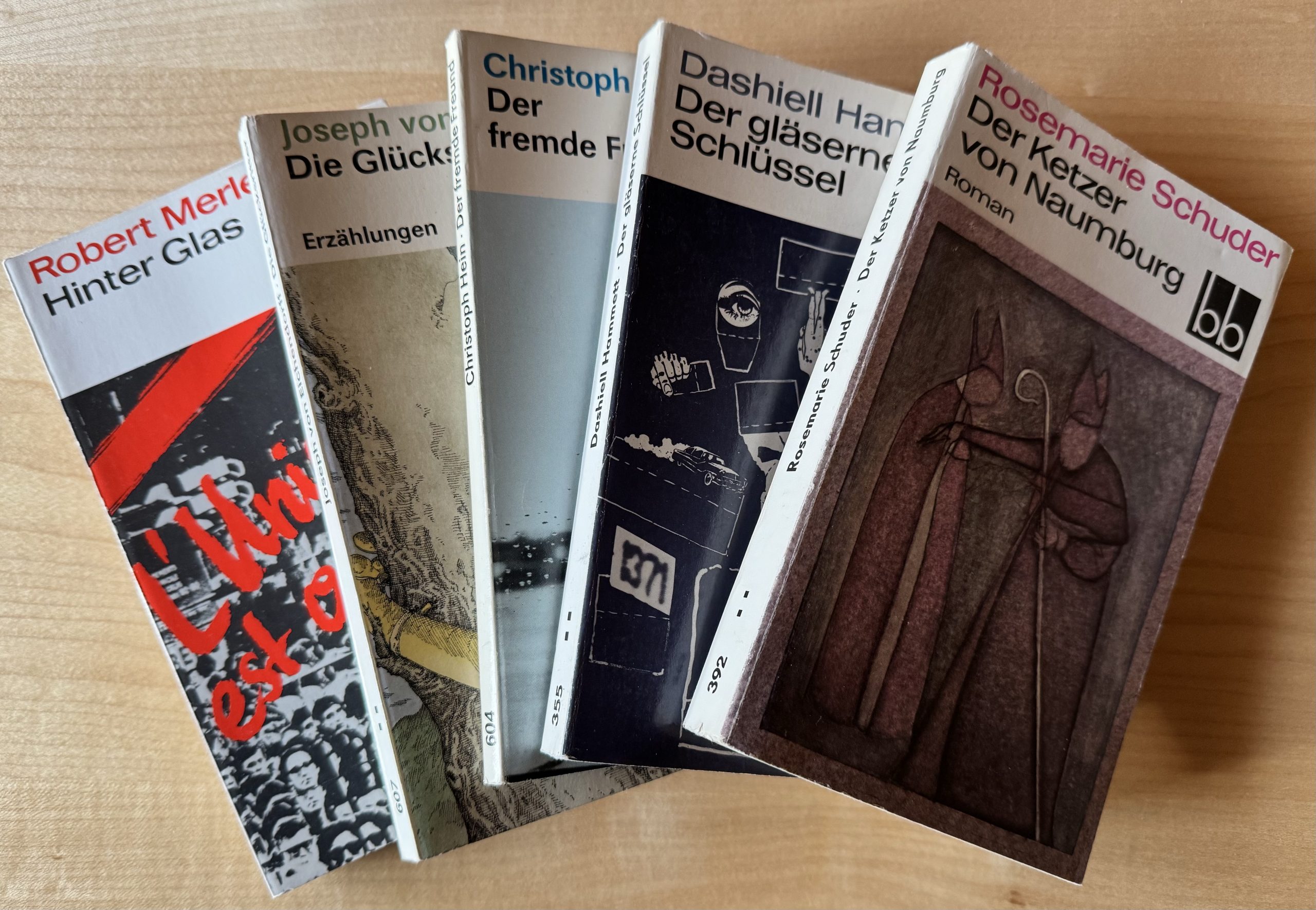 Jetzt, im Winter, habe ich mir ein paar dieser Bücher wieder hervorgeholt. Das Wetter ist schlecht, stürmisch, im Garten kann man auch gerade nichts machen. Was passt da besser als ein Krimi wie „Der gläserne Schlüssel“ von Dashiell Hammett (Übers. Hans Wollschläger), ein historischer Roman wie „Der Ketzer von Naumburg“ von Rosemarie Schuder, oder die Novelle „Der fremde Freund“ von Christoph Hein. Und wenn ich etwas weniger Muse oder Zeit habe, lese ich eben ein paar Erzählungen aus „Die Glücksritter“ von Joseph von Eichendorff.